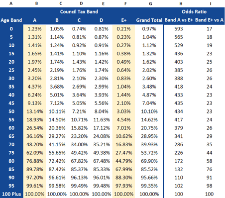 As an example, the table above presents a comprehensive breakdown of cumulative probabilities of death based on both age bands and council tax bands in the city of Manchester. Similar tables can be constructed for a variety of different geographies that can then be straightforwardly imported into existing longevity models structures.
